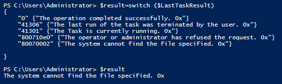 $LastTaskResult= ‘{0:x}’ -f ((Get-ScheduledTaskInfo “TestMonitor”).LastTaskResult)