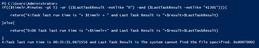 if the time span minutes for last run is more than 5Min or the task result is neither 0 (success) nor 41301 (task currently running) – we have used a combination of operators to structure the condition using -gt (grater than), -or, -notlike (to represent the Not matching condition), -and – the condition will return the message in “value:message” format, which in our case: “4:Task last run time: “+$timelr+” and Last Task Result: “+$result+$LastTaskResult this message is specific to PRTG to interpret and if you are using another monitoring method you can modify the return message accordingly